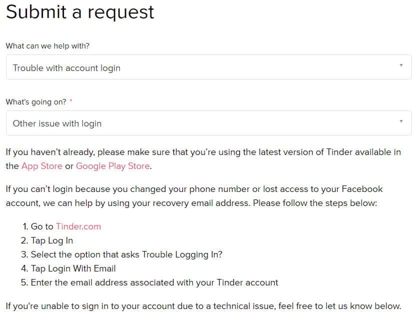 Go to help.tinder.com, tap Troubleshooting, then tap “I can't log in to my account” by the end of the information displayed on that page, you’ll be seeing “Get in touch”, click there.