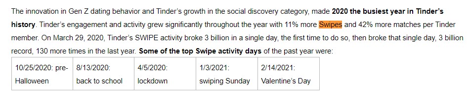 - The highest number of swipes – 3 billion – to be recorded on Tinder was on March 28th, 2020, and over 20% of Tinder users swipe right on brands.