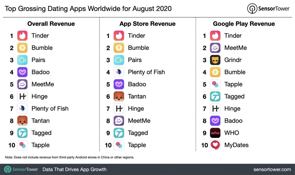 On the report of SensorTower Tinder is recorded to be the top grossing dating app worldwide, August 2020.